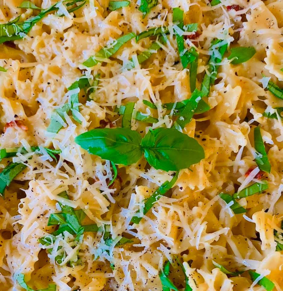 Cook pasta according to package directions; set aside. In a large skillet over medium heat melt butter, then add olive oil. Add garlic to butter/oil mixture and heat until fragrant (when you start to smell the garlic). Whisk in flour and cook for a minute or two, then slowly whisk in vegetable or chicken broth, milk, and heavy cream. Whisk in sun-dried tomatoes, seasonings, and Parmesan cheese. Continue to cook sauce, stirring constantly, until thickened. Toss in cooked pasta and stir until well combined, check seasoning, sprinkle top with with fresh basil, Parmesan cheese, and red pepper, if using. Serve immediately.